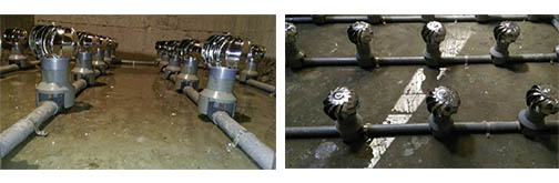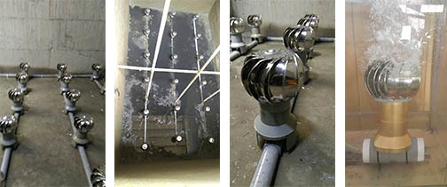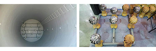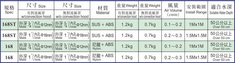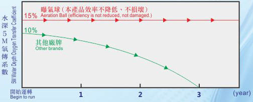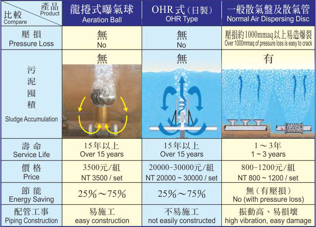 全球首創 龍捲式曝氣球 安裝效益 1. 氧傳效率穩定,不會隨使用時間長而遞減效率。 2. 節省能源可達25%~75%(因無壓損及水深之限制)。 3. 耐用15年以上。 4. 安裝簡便,無需更換任何耗材,永不阻塞。 5. 全球首創球體會運轉、曝氣、攪拌底泥雙功能。 產品功能比較表 長期使用產品之氧傳效率曲線圖比較 本產品曝氣球規格表 安裝現場實例圖